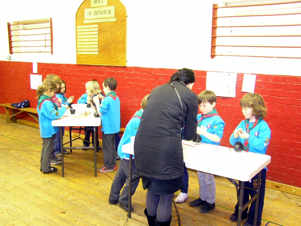 Tonight the Beavers made a bird feeder using a small basin which was filled with a tasty mix of fat, seeds and peanuts. They were also shown pictures of the sort of bird that they might see in the garden at this time of year.