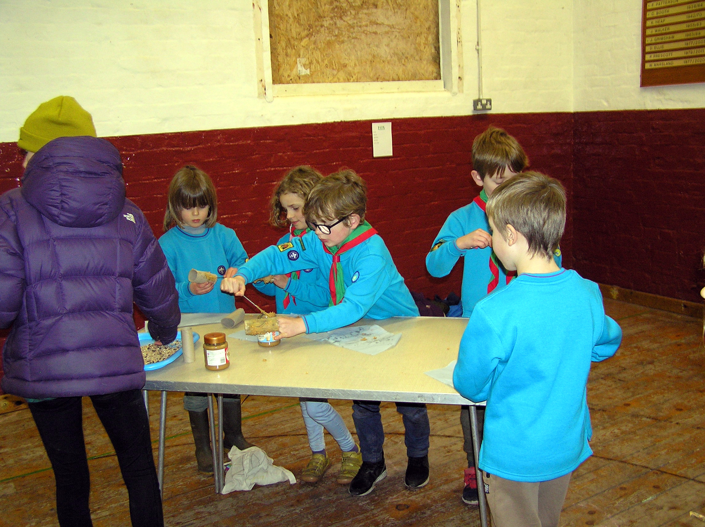This week the Beavers were making Bird Feeders. They did this by covering the outside of the cardboard tube from a toilet roll with peanut butter. This was then rolled in a tray filled with bird seed. Rolling the tub…
