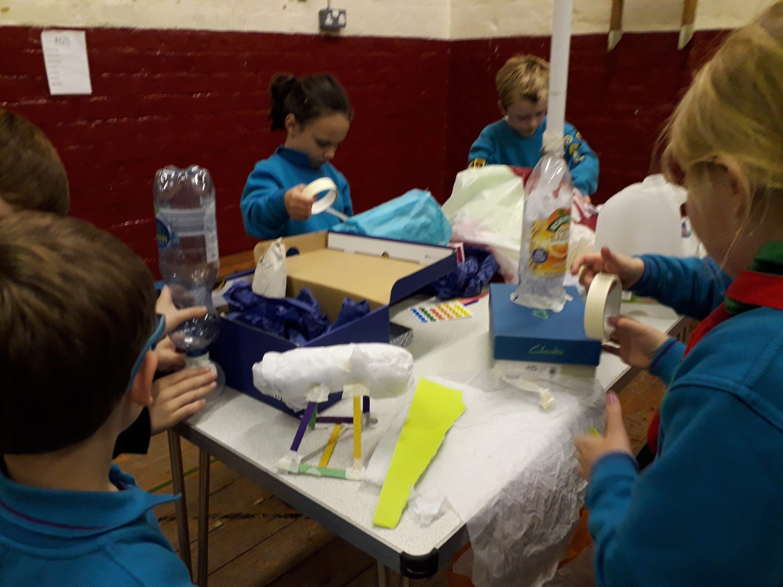 This week the Beavers were asked to bring in some ‘junk’ – cardboard boxes, egg boxes, milk bottles, etc and they were then asked to make a model of some form of transport. Some of their ideas were very imaginative.